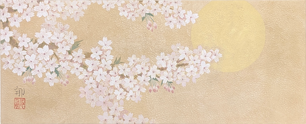 岩絵具特有の落ち着いた発色が、夜の闇を重苦しくなく、気品ある金色やベージュのトーンでまとめ上げています。光を吸い込み、また静かに放つような絵肌は、見る角度によって桜の花びらが刻一刻と表情を変えるさまを再現しています。
