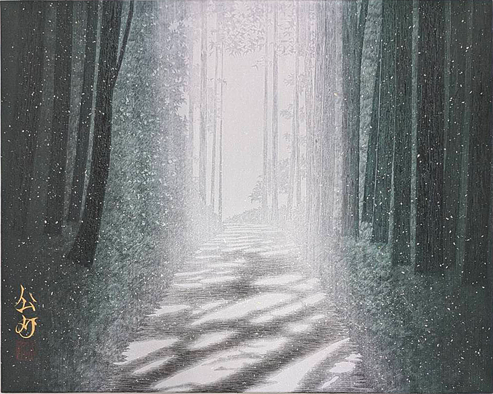 深い森の静寂の中で、無数の光がきらきらと舞い上がるように輝きます。淡い白光が空気に溶け込み、道の奥へと吸い込まれていくその瞬間を、狩俣公介は繊細な筆致で捉えています。静けさの中に宿る光の粒子が、森全体をやわらかく照らし出しています。