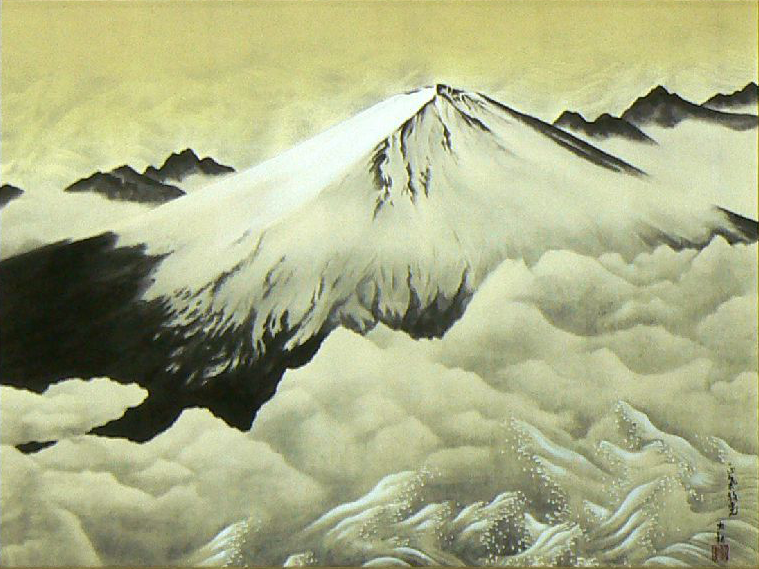気高い秀麓の富士山を日本に見立てて中央にすえ、周囲を太平洋と日本海とで囲み、バックには金泥を刷いて曙を表現し、日本を中心に世界があるという気宇壮大な構図で描かれている。気力充実した大観の熱気がひしひしと伝わってくるようである。