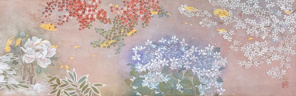 「めぐる四季図」は、春・夏・秋・冬という四つの季節がひとつの画面の中で静かに寄り添い、時間が円を描くようにめぐり続ける世界を表現した作品です。桜の白い花びらが春の軽やかさを運び、紫陽花の淡い紫が初夏の湿り気を感じさせ、白い芍薬が夏の生命力をそっと咲かせ、紅葉の深い赤が秋の成熟を添えています。背景に広がる桃色から紫への柔らかなグラデーションは、朝焼けから夕暮れへと移ろう空のようでもあり、季節と季節の境目が溶け合う“時間の気配”そのものです。藤原郁子の特徴である両手描きの技法によって、線や花弁には左右のリズムが宿り、人工的な緊張のない自然な調和が生まれています。季節は終わるのではなく、めぐりながら続いていく──そんな静かな哲学が、花々の姿を通してそっと語られる作品です。