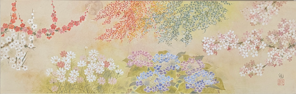 本来は一堂に会することのない日本の春夏秋冬を彩る花々が、静謐な月明かりの下で命を謳歌するように舞い踊る幻想的な光景を描き、岩絵具特有の清澄な発色と繊細な筆致を通じて、万物に宿る生命の瑞々しさと永遠に続く時の循環、そして再生への深い祈りを一つの画面に凝縮した、叙情性溢れる秀作です。